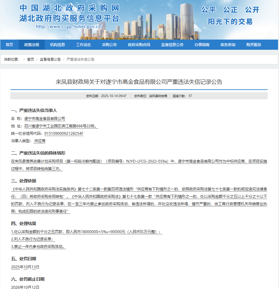 炒股配资平台股票配资门户 高金食品控股公司因违规转包被罚9万元,禁止一年内参与政府采购