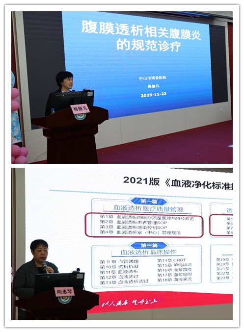 竞赛结束后,各大医院教授结合临床实践与行业前沿动态,带来了干货满满的专题授课。梅主任以《腹透相关性感染的诊疗新进展》为题,围绕血透患者个体化治疗方案制定、复杂病例诊疗思路等内容进行深度解析,结合典型案例分享了丰富的临床经验与实用技巧,为医护人员破解诊疗难题提供了新思路、新方法。陶护长则聚焦《血液透析中心感染控制》,从护理操作规范、患者心理护理、并发症预防护理等方面展开详细讲解,强调了护理工作中“细节决定成败”的重要性,引导医护人员进一步规范护理行为,提升护理服务的精细化水平。李燕飞护长讲《血液透析护理质量控制与持续改进》,以临床实际需求为导向,结合多年一线护理与管理经验,从血液透析护理质量控制的核心要素、关键流程入手,系统解析了透析前患者评估、透析中设备操作规范、透析后并发症防控等重点内容。授课过程中,三位专家还与现场医护人员进行互动交流,耐心解答大家在临床工作中遇到的疑问,现场学习氛围浓厚。